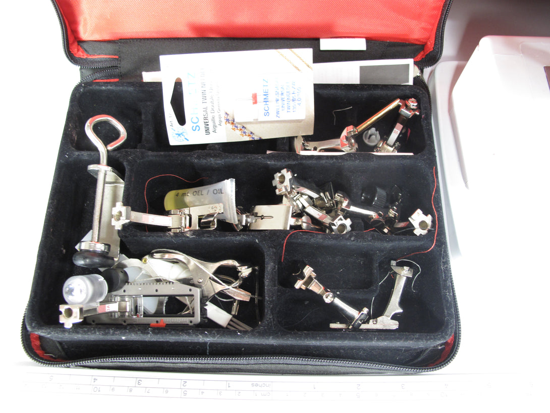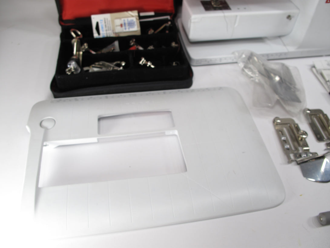 Included Accessories - rolling bag (damaged wheel as shown), various feet, binder attachments, knee lifter, power cord, pedal, all other accessories shown