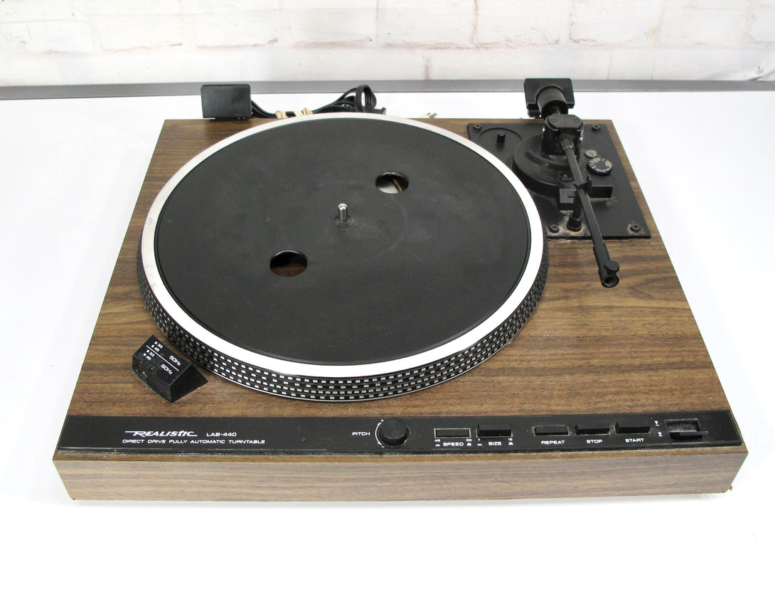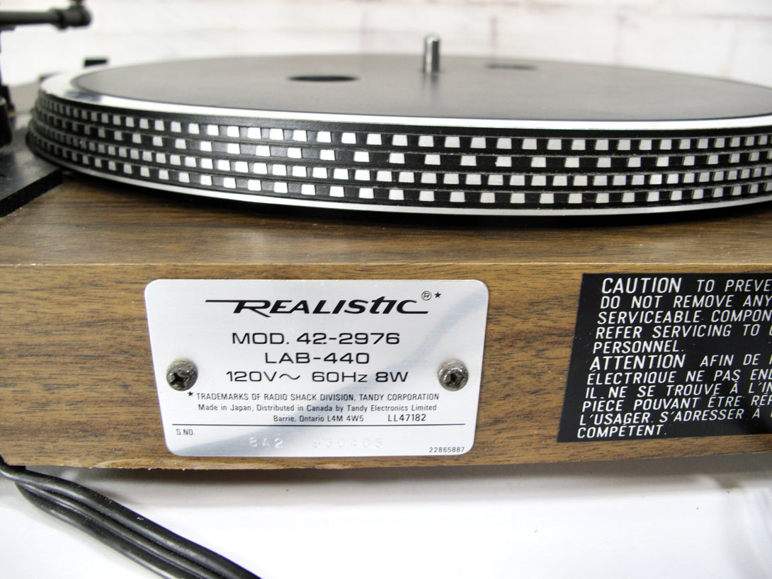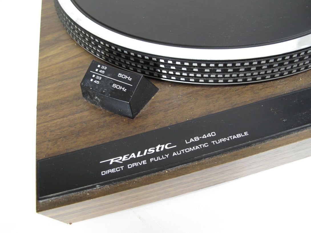 The Realistic LAB-440 is a direct-drive, fully automatic turntable released in 1982 with a wow and flutter of  and a signal-to-noise ratio of  dB. Key features include a pitch control with a  adjustment, auto-in and auto-return,...